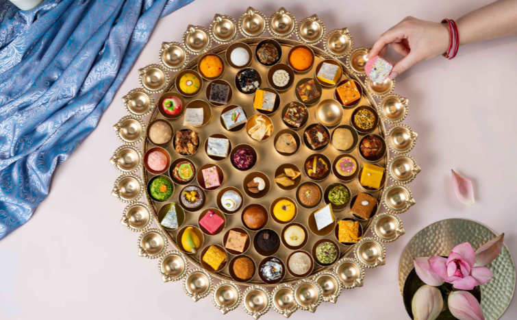 Kaju Fancy, Rose Laddoo, Gulkand Katori, Biscoff Laddoo, Anjeer Roll, Biscoff Dates Roll, Pista Laddoo, Peanut Almond Laddoo, Kaju Mango.